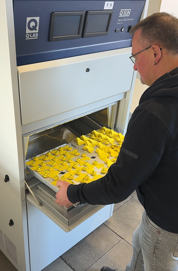 Eine Konformität mit den Standards von ICAR, CCIA, PAS oder nach den EU-Durchführungsverordnungen 2021/520 bzw. 2021/963 sowie den zugrundeliegenden ISO Normen sind entscheidend für eine sichere Tiererfassung. Um die steigende Nachfrage zu bedienen, hat das Testzentrum Technik und Betriebsmittel der DLG TestService GmbH in Groß-Umstadt sein Prüflabor erweitert: Mit der neuen Xenon-Lichtbogenkammer werden ab sofort die Kapazitäten für die im Rahmen der Prüfungen im Bereich Tierkennzeichnung essenzielle Bewitterungs-, Lichtechtheits- und Photostabilitätsprüfung verdoppelt. Die Bewitterung mit UV-Licht und Regen stellte bisher einen Flaschenhals bei den Ohrmarkenprüfungen dar, der nun sukzessive erweitert wurde. Die neue Prüfkammer sowie die bereits bestehenden Prüfgeräte ermöglichen darüber hinaus realitätsnahe Belastungstests für weitere Produkte nach ISO 4892-2 und ISO 4892-3 innerhalb und außerhalb der Landwirtschaft, beispielsweise für Markierungs- und Identifikationslösungen, für Kunststoff- und Elastomerkomponenten für die Tierhaltung sowie für Labels, Etiketten, Plaketten und andere betriebsmittelspezifische Produkte.