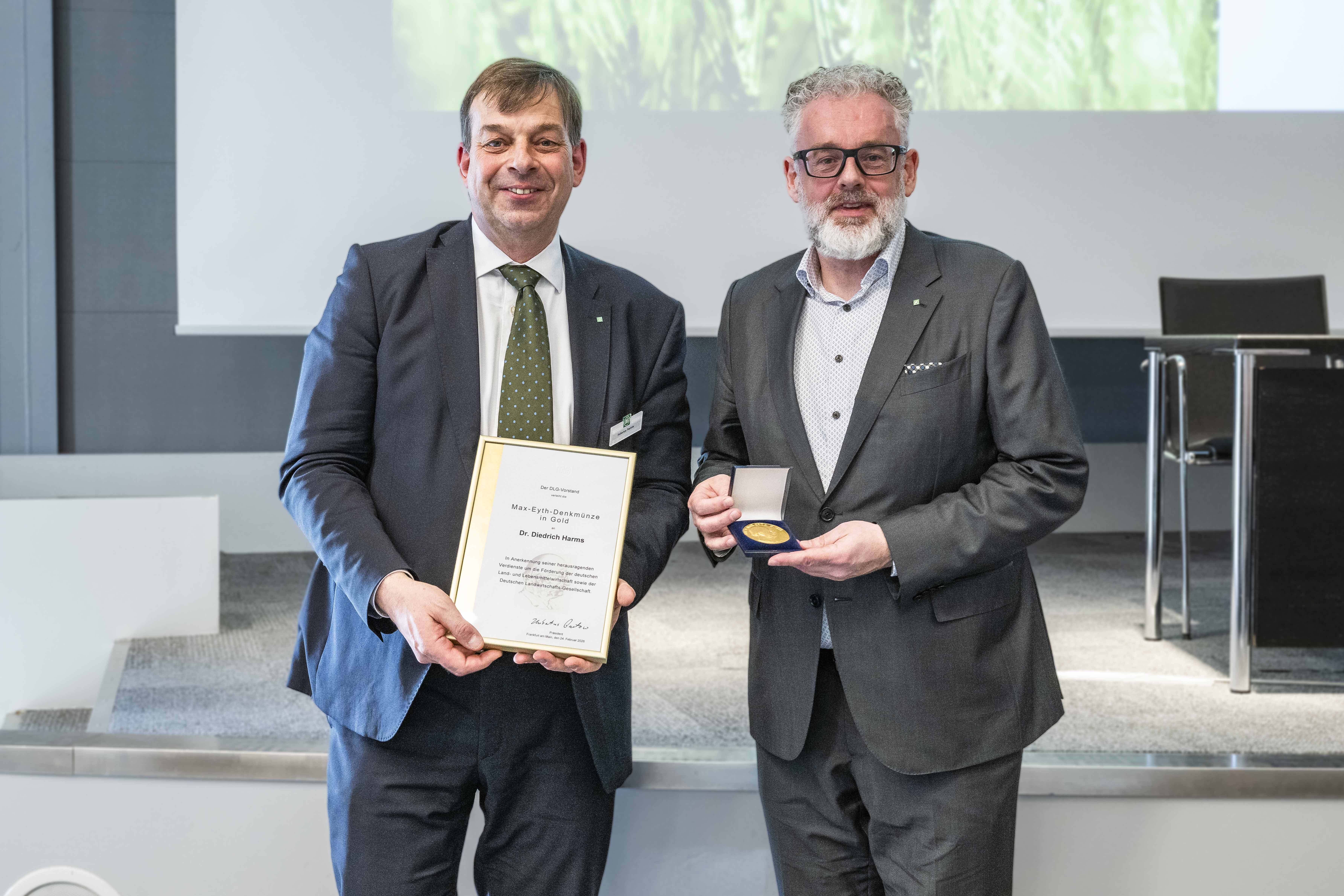 Foto: DLG-Präsident Hubertus Paetow (links) überreichte Dr. Diedrich Harms Urkunde und Medaille der Max-Eyth-Denkmünze in Gold.