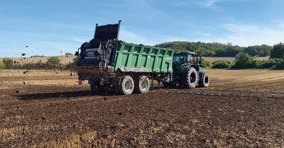 The test was carried out in August 2025 on a harvested wheat field in Lower Austria. The Brantner TA 24078 Power-Spread pro was equipped with a CSP2-2 twin-disc spreading unit featuring two horizontal beaters. Distribution quality was assessed at application rates of 10 and 30 t/ha using cattle manure with a dry matter content of 19.4% and a bulk density of 726 kg/m³. Both transverse and longitudinal distribution were measured; no other criteria were evaluated.