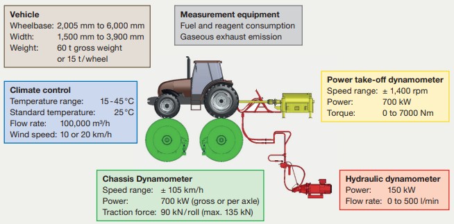 All the measurements were carried out at DLG’s dedicated off-road / agricultural chassis dyno (Figures 2 and 3). Our chassis dyno ranks among the world’s highest-capacity test stands for measuring vehicle performance and fuel consumption. Here, tests are conducted on tractors, machinery and other commercial vehicles.