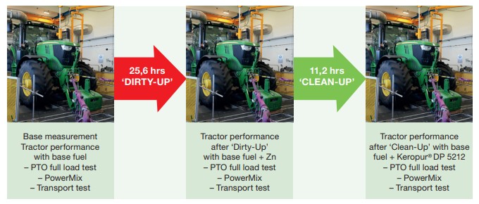 The performance was restored to > = 90 % after 8 hours, eq to 355 liter (1 vehicle tank) and to 100 % after 11.2 operating hours, eq to 500 liter (1.6 vehicle tanks) fuel consumption with Keropur® DP 5212 additive, showing significant:
