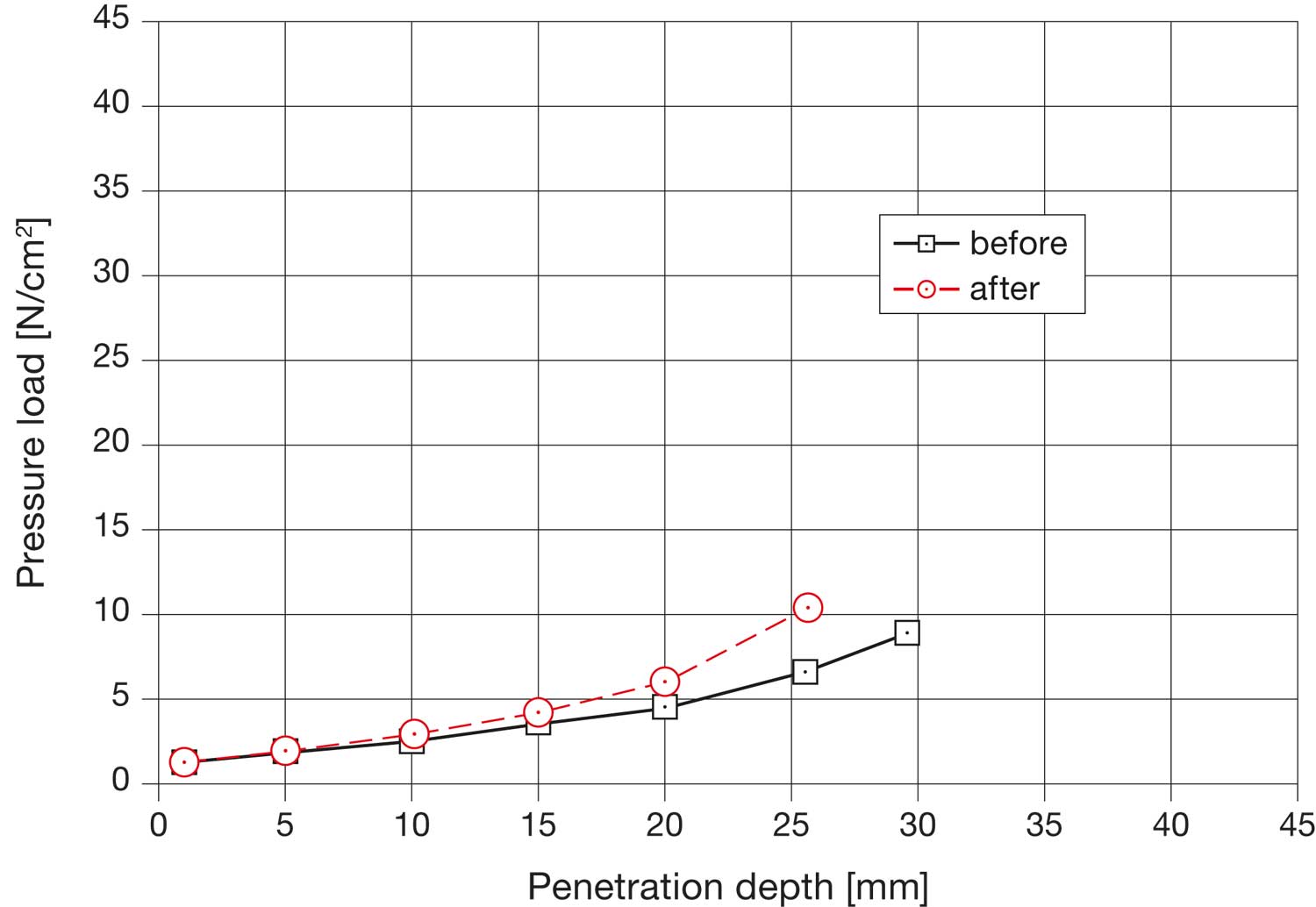 A penetration depth of 29.6 mm was determined in ball-indentation tests in new condition with a calotte (r = 120 mm) and a penetration force of 2,000 N (corresponding to approx. 200 kg). A bearing pressure of 9.0 N/cm² was calculated from this, indicating a relatively small load on the carpal joints when lying down and standing up. The elasticity was measured following a permanent loading test with a steel foot (contact area 75 cm²) with 100,000 alternating loads at 10,000 N. Following the endurance test, the penetration depth of the calotte decreased from 29.6 mm to 25.6 mm. The bearing pressure increased from 9.0 N/cm² to 10.4 N/cm² (see Figure 2). This corresponds to a decrease in deformability and elasticity. The requirements relating to BTS conformity are met.