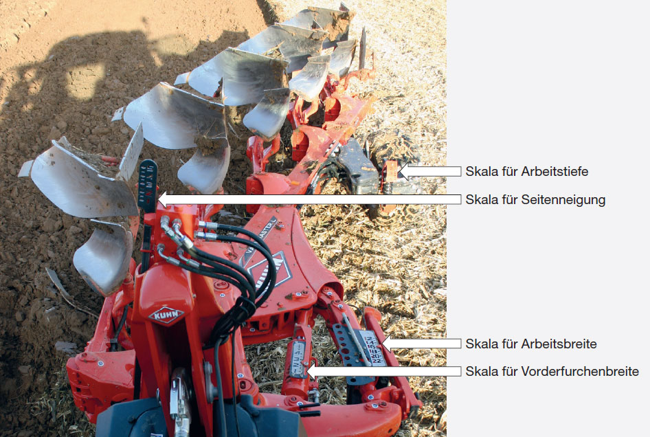 Work depth, work width, first furrow width and tilt are controlled from the cab-mounted spools after selecting the relevant function from the KTS 10 control unit. Each cylinder on the plough has its own scale for convenient adjustment. All these setting options were assessed as “very good” (++).