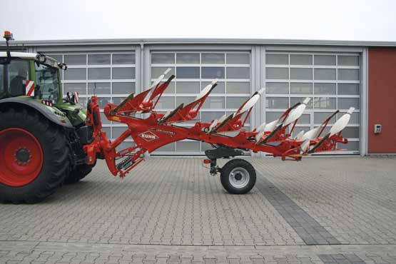 The five-furrow Kuhn Vari-Master L 5 NSH reversible plough is mounted in the three-point linkage of a tractor (category 3/4 N). Its total mass is 2,780 kg. Its work width can be set infinitely variably from 1.50 m to 2.75 m. The underbeam clearance is 80 cm. The plough had a hydraulic trip system, the so-called solid LPO mouldboards and maize skimmers.