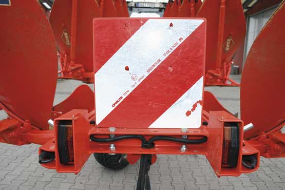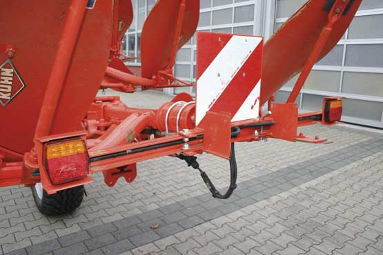 The plough has a lighting system that is permanently installed and not removed for field work. Instead, the two bars are folded forward which brings the lights in a safe position. There is no dust-/waterproof storage position for the electric connector. The lighting system is assessed as “good” (+).