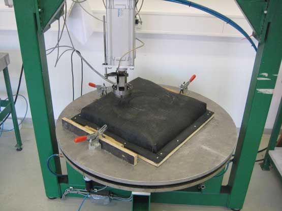 The permanent tread load is carried out on a test stand with a round steel foot in the standard test programme with 100,000 alternating loads at 10,000 N (corresponding to approx. 1000 kg). The steel foot is adapted to the natural conditions as an “artificial cow foot”. The foot has a diameter of 105 mm and therefore a contact area of 75 cm²; the carrying edge of the hoof is simulated by a 5 mm wide ring on the periphery of the sole that projects 1 mm above the rest of the surface.