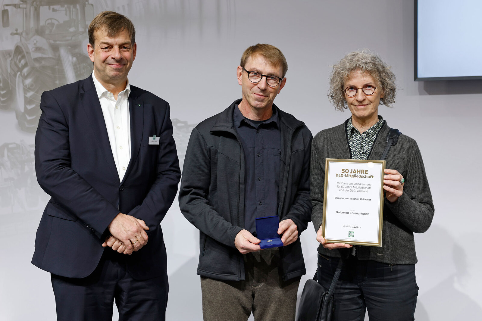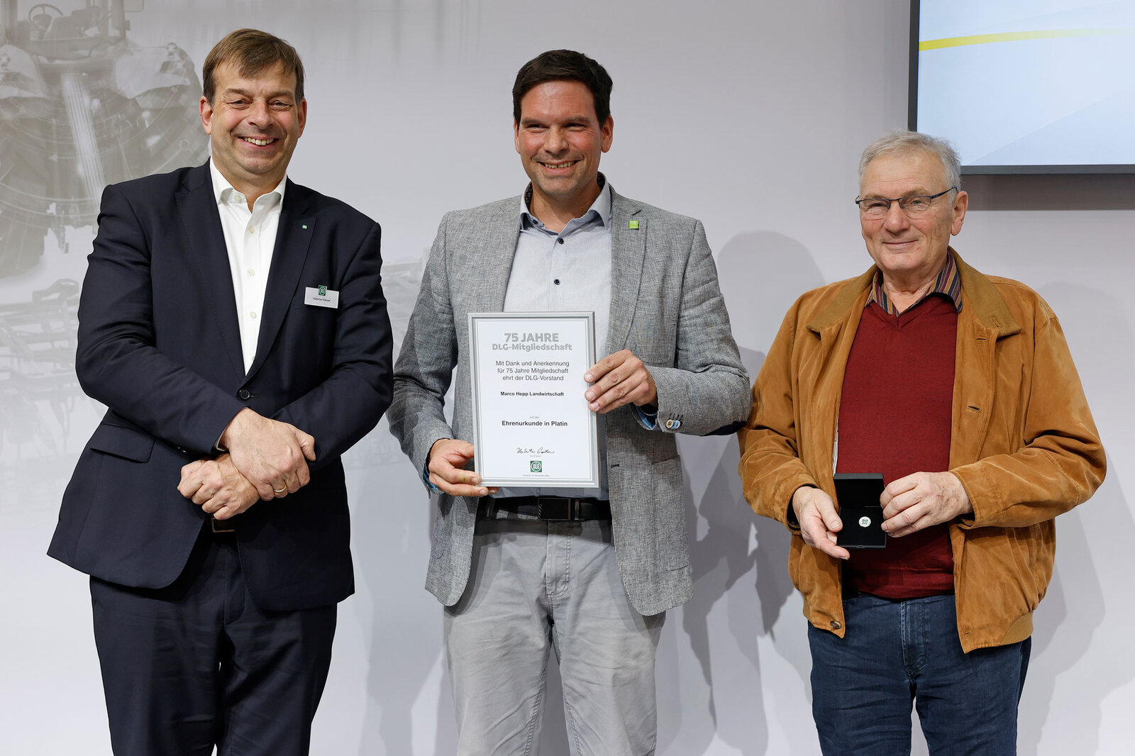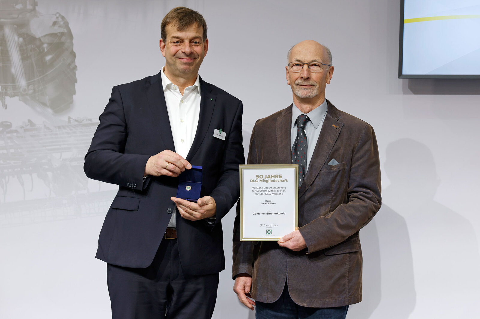 Verbunden mit Dank und Anerkennung zeichnete der DLG-Vorstand im Rahmen der AGRITECNICA im November 2025 38 DLG-Mitglieder für 50 Jahre DLG-Mitgliedschaft und 23 DLG-Mitglieder für 75 Jahre DLG-Mitgliedschaft mit Ehrenurkunden und Ehrennadeln in Gold und Platin aus. DLG-Präsident Hubertus Paetow überreichte die Urkunden in einer Feierstunde auf dem DLG-Stand und hob dabei die Bedeutung der DLG-Mitglieder in seiner Ansprache hervor. Er lobte Verstand und Leidenschaft, mit denen diese sich in die DLG als Verein einbringen und so dessen Basis und Rückgrat bilden. Paetow betonte die langjährige Verbundenheit, die von einer starken Gemeinschaft zeuge, deren Neugierde, Mut und Suche nach zukunftsgerichteten Ideen uns alle vereint