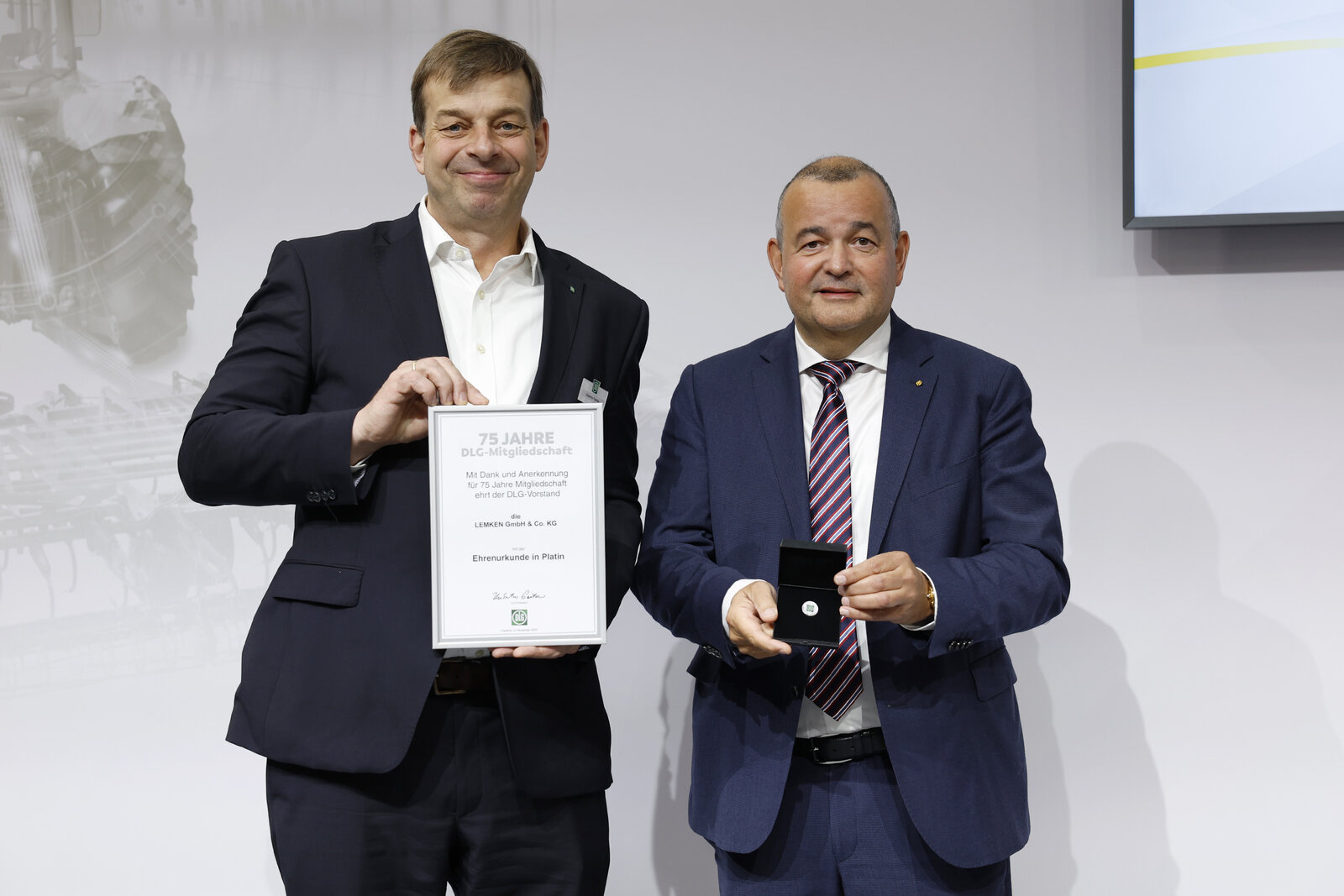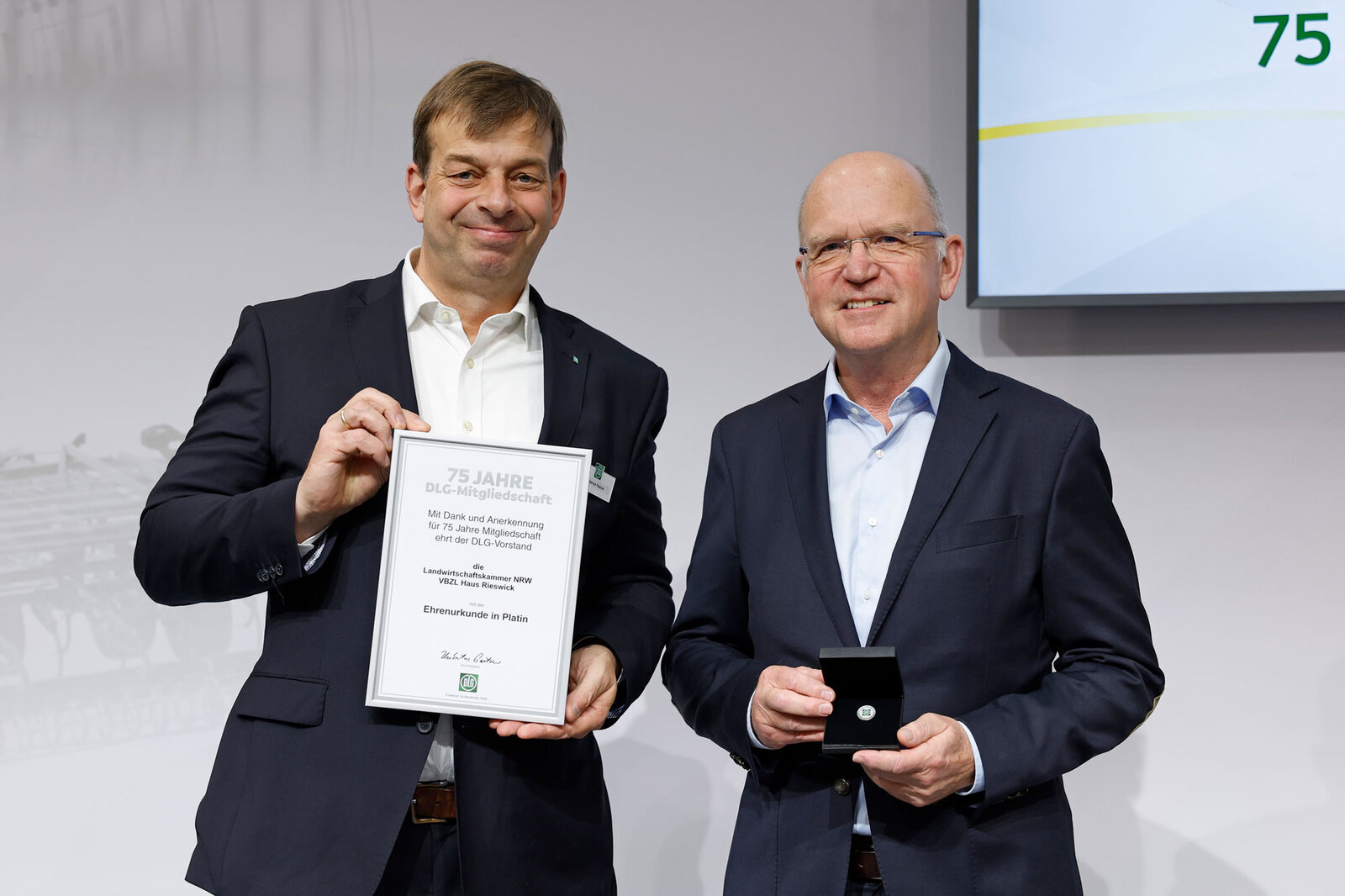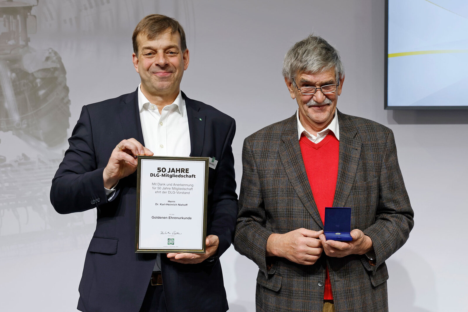 Verbunden mit Dank und Anerkennung zeichnete der DLG-Vorstand im Rahmen der AGRITECNICA im November 2025 38 DLG-Mitglieder für 50 Jahre DLG-Mitgliedschaft und 23 DLG-Mitglieder für 75 Jahre DLG-Mitgliedschaft mit Ehrenurkunden und Ehrennadeln in Gold und Platin aus. DLG-Präsident Hubertus Paetow überreichte die Urkunden in einer Feierstunde auf dem DLG-Stand und hob dabei die Bedeutung der DLG-Mitglieder in seiner Ansprache hervor. Er lobte Verstand und Leidenschaft, mit denen diese sich in die DLG als Verein einbringen und so dessen Basis und Rückgrat bilden. Paetow betonte die langjährige Verbundenheit, die von einer starken Gemeinschaft zeuge, deren Neugierde, Mut und Suche nach zukunftsgerichteten Ideen uns alle vereint