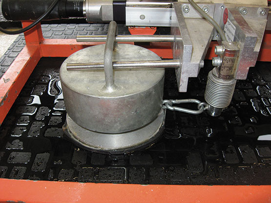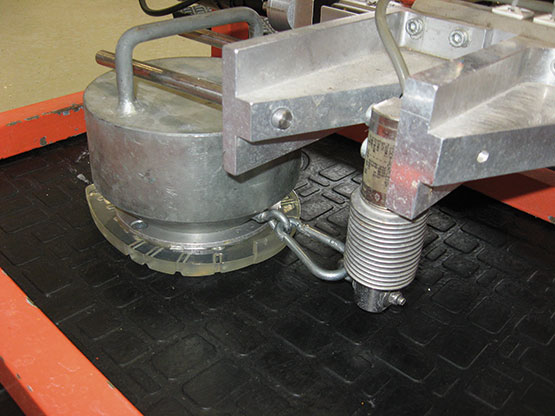 mit dem Aufstandsgewicht ins Verhältnis gesetzt und daraus der Reibbeiwert µ berechnet. Die Prüfungen fanden sowohl auf trockener als auch auf mit Wasser befeuchteter Oberfläche statt.