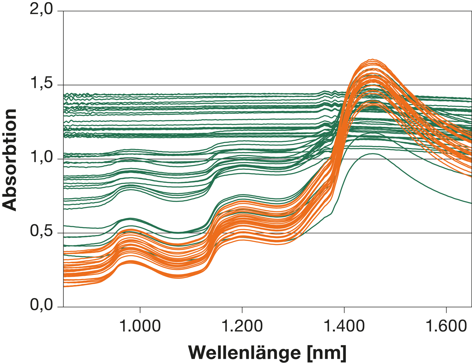 Die Spektren werden gesammelt, abgelegt und von „falschen“ Werten bereinigt (Multifile, Bild 4). Abschließend werden die bereinigten Spektren gemittelt (Singlefile, Bild 5) und zur Berechnung des Zuckergehalts genutzt. Das System greift dabei auf eine Kalibration zurück, die speziell für diesen Einsatz entwickelt und mit Daten aus ca. 15 Jahren erstellt wurde.