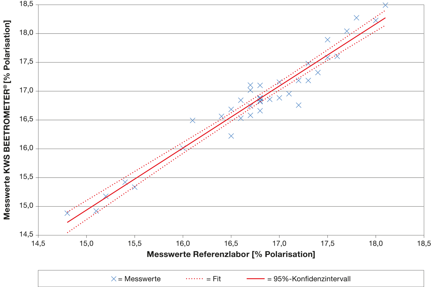 Die Berechnung der Beziehung zwischen den Methoden ICUMSA GS6-3 und NIRS ergab einen Regressionskoeffizienten von 0,94. Bild 15 zeigt den engen Zusammenhang der beiden Analyseverfahren.