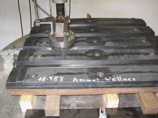 Bei den Eindruckversuchen mit einem runden Stahlfuß betrug die Eindringtiefe des Spaltenbodenbelages im Neuzustand 7,1 mm. Der hieraus errechnete Auflagedruck beträgt 26,67 N/cm². Die Elastizität wurde nach einer Dauertrittbelastung mit dem Stahlfuß mit 250.000 Wechselbelastungen bei 5.000 N gemessen. Die Eindringtiefe des Stahlfußes verringerte sich nach dem Dauertest auf 7,0 mm (siehe Bild 4).