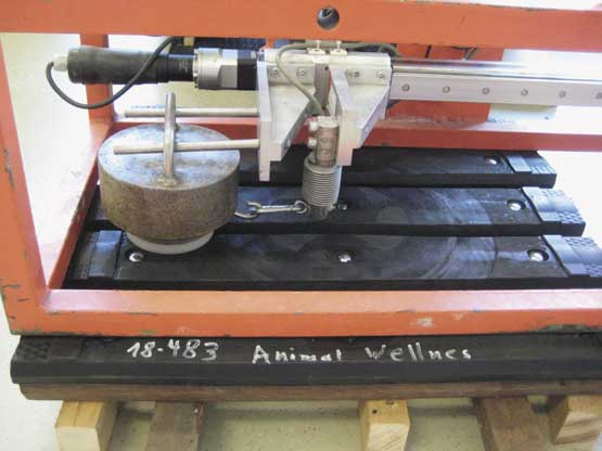 Die Messung der Dauertrittbelastung erfolgt im Standard Testprogramm mit 250.000 Wechselbelastungen bei 5.000 N (entspricht ca. 500 kg) auf einem Prüfstand mit einem runden Stahlfuß. Der Stahlfuß ist als „künstlicher Kuhfuß“ den natürlichen Gegebenheiten nachempfunden. Der Fuß hat einen Durchmesser von 105 mm und somit eine Aufstandsfläche 75 cm², der Tragrand der Klaue wird durch einen 5 mm breitem Ring an der Peripherie der Sohle, der die übrige Fläche 1 mm überragt, simuliert.