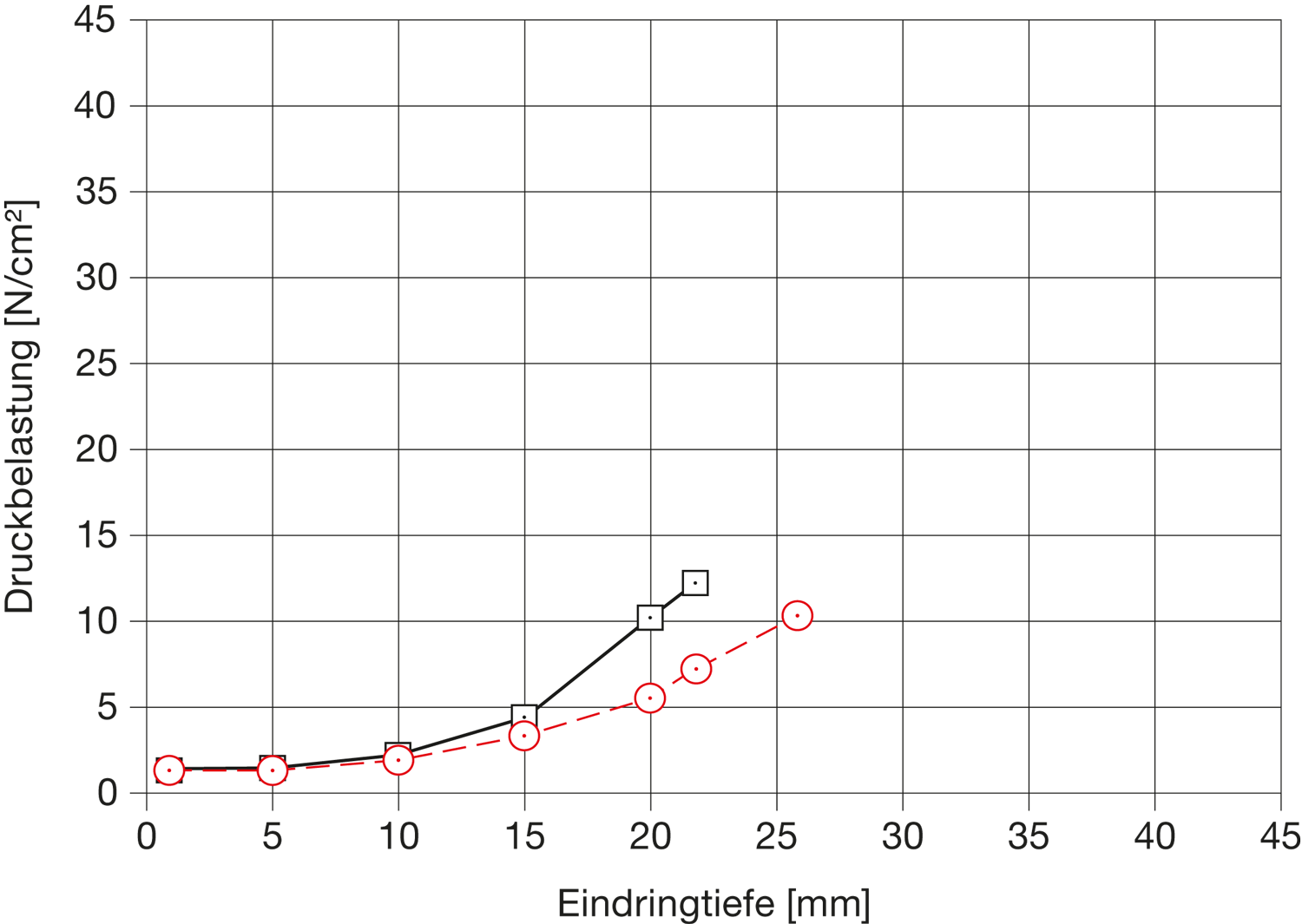 Die Elastizität wurde nach einer Dauertrittbelastung mit einem Stahlfuß (Aufstandsfläche 75 cm²) mit 100.000 Wechselbelastungen bei 10.000 N gemessen. Die Eindringtiefe der Kalotte erhöhte sich nach dem Dauertest von 21,8 mm auf 25,8 mm. Der Auflagedruck verringerte sich von 12,2 N/cm² auf 10,3 N/cm² (siehe Bild 3). Das bedeutet, dass Verformbarkeit und Elastizität zunehmen.