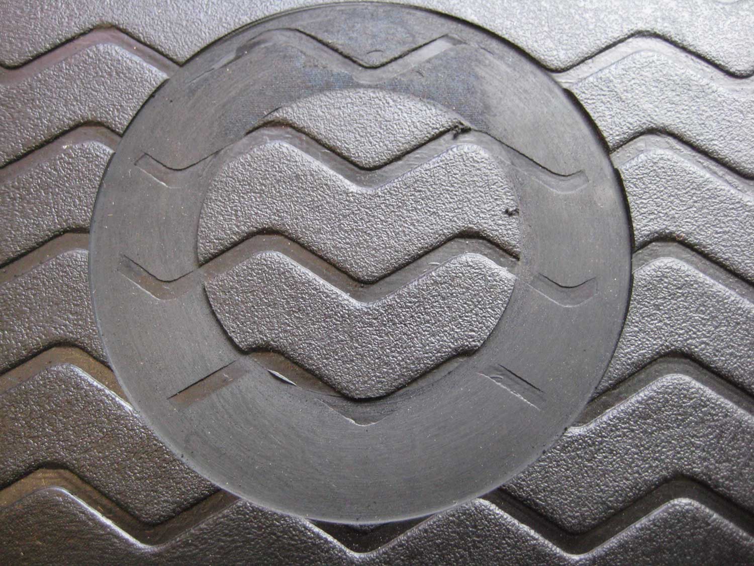 schwarzer Gummimatte mit Gewebeeinlage, ca. 5,3 mm dick, mit Wellenprofil auf der Oberseite (Welle ca. 1,2 mm tief und ca. 4,5 mm breit); Unterseite ohne Profilierung